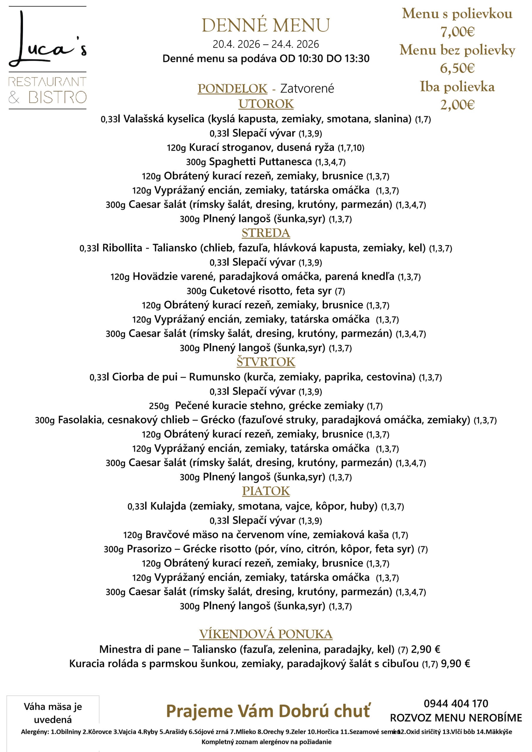 Vychutnajte si každý deň čerstvo pripravené obedové menu plné chutí a kvalitných surovín. Ponúkame vyvážené jedlá, ktoré spájajú tradičné recepty s modernou gastronómiou. Príďte si pochutnať na lahodnom obede v príjemnej atmosfére Lucas Restaurant & Bistro.